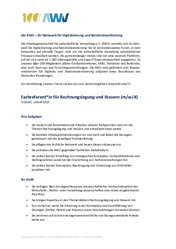 Für unsere AWV-Gremienarbeit suchen wir eine engagierte Person als Referent (m/w/d) für den Bereich Rechnungslegung und Steuern.