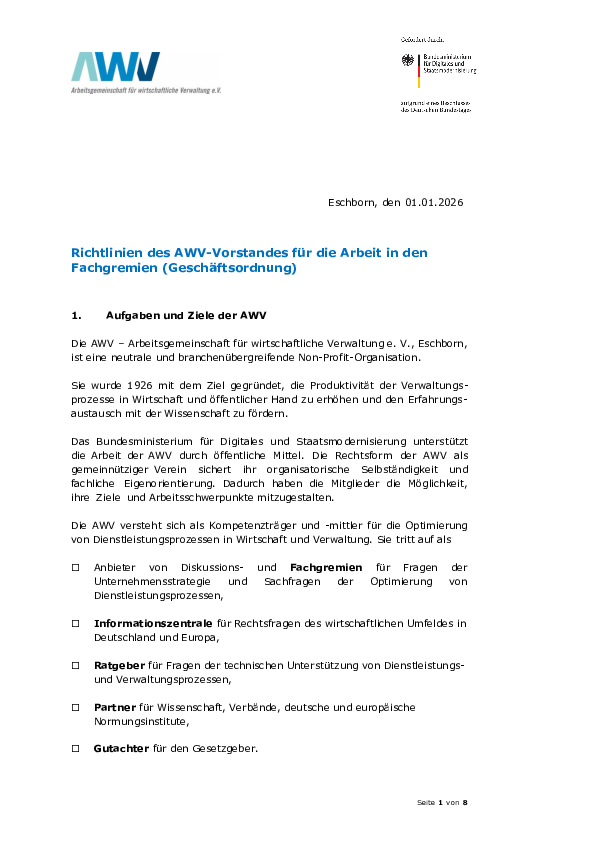 Die Grundlagen für eine offene Diskussion und vertrauensvolle Zusammenarbeit sind in den AWV-Leitlinien und in den satzungsrechtlichen Vorschriften (Satzung) festgelegt. Basis der ehrenamtlichen Arbeit im FeRD sind die Richtlinien des AWV-Vorstands für die Arbeit in den Fachgremien (Geschäftsordnung).